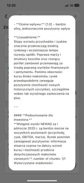 - Newag (NWG) – zakup po publikacji skonsolidowanego raportu za I półrocze 2025 r., który pokazał wyjątkowo mocne wyniki: przychody +47,6% r/r, zysk netto +177,7% r/r, EBITDA +128,9% r/r, rekordowe marże i EPS na poziomie 2,88 zł. To raport fundamentalnie przełomowy, uzasadniający wysoką ocenę wpływu ([1.0]) i wskazujący duże prawdopodobieństwo wybicia nowych historycznych szczytów.