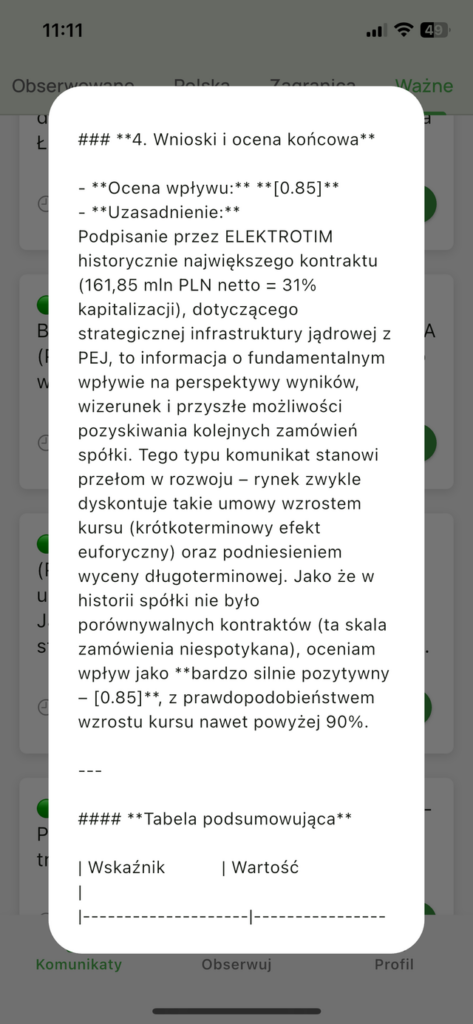 - Elektrotim (ELT) – zakup wsparty sygnałem AI po ogłoszeniu historycznego kontraktu z PEJ o wartości 161,85 mln PLN (31% kapitalizacji spółki). To przełomowa umowa o fundamentalnym znaczeniu, która może długoterminowo podnieść wycenę.