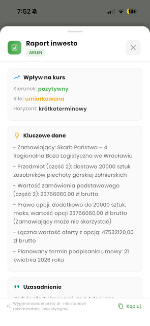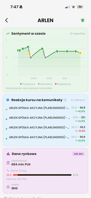 W piątek do portfela dołączył Arlen z alokacją 5% portfela. Decyzja oparta bezpośrednio na ocenie sentymentu z aplikacji inwesto24 — kolejny przykład strategii sygnałowej w praktyce.