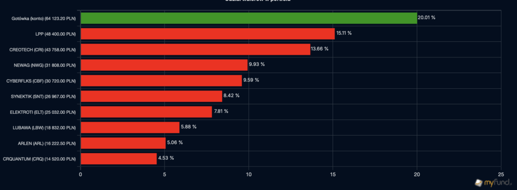 Portfel kontynuuje strategię opartą na sygnałach inwesto24. Aktualna liczba pozycji wymaga selekcji — koncentracja na najsilniejszych trendach pozostaje priorytetem.